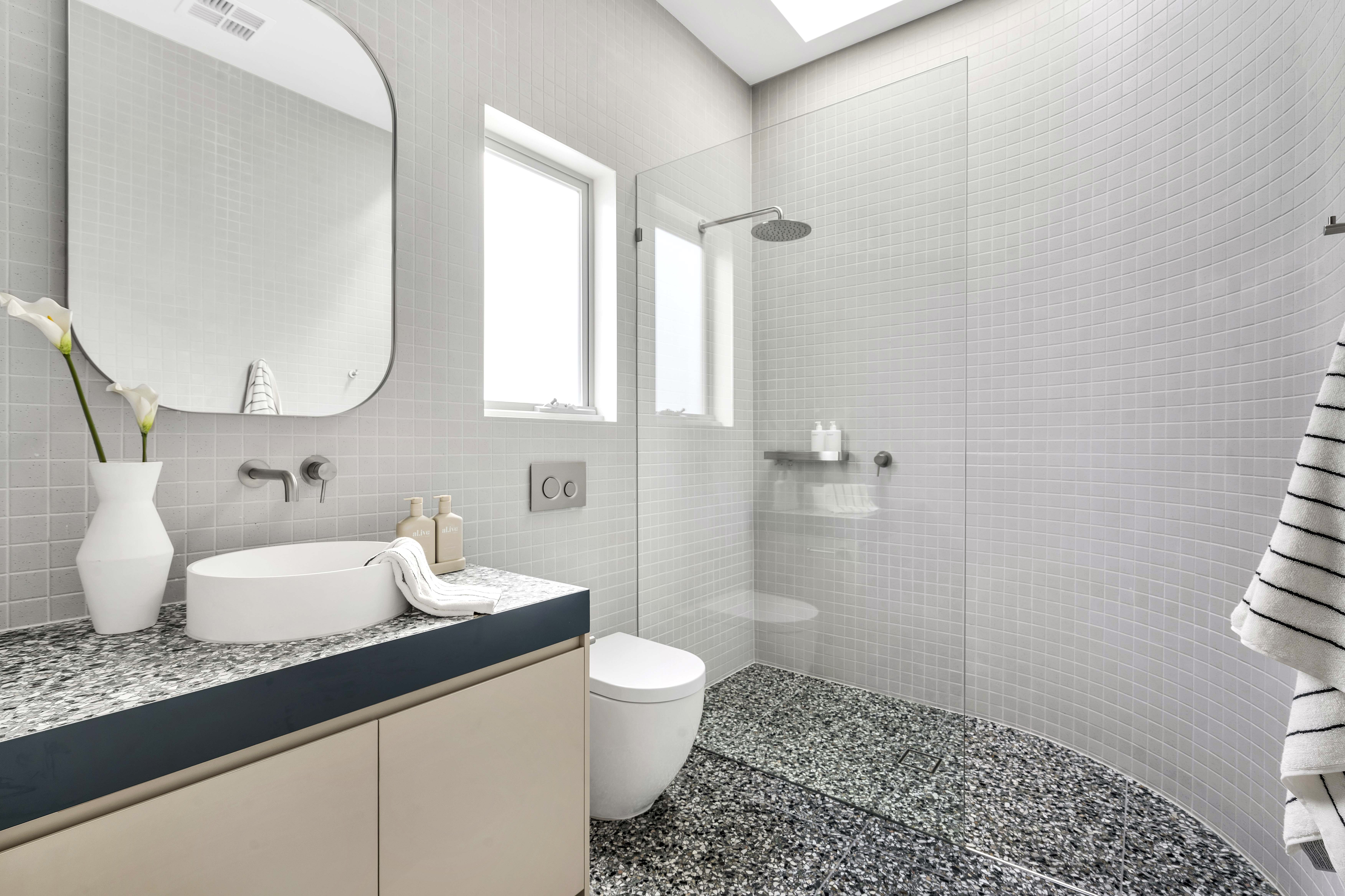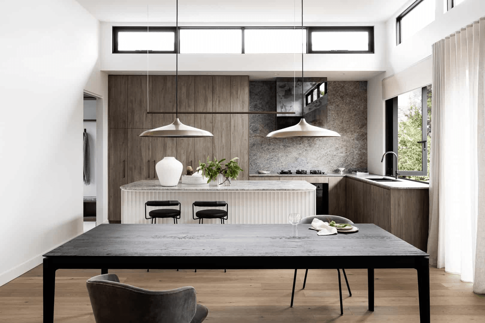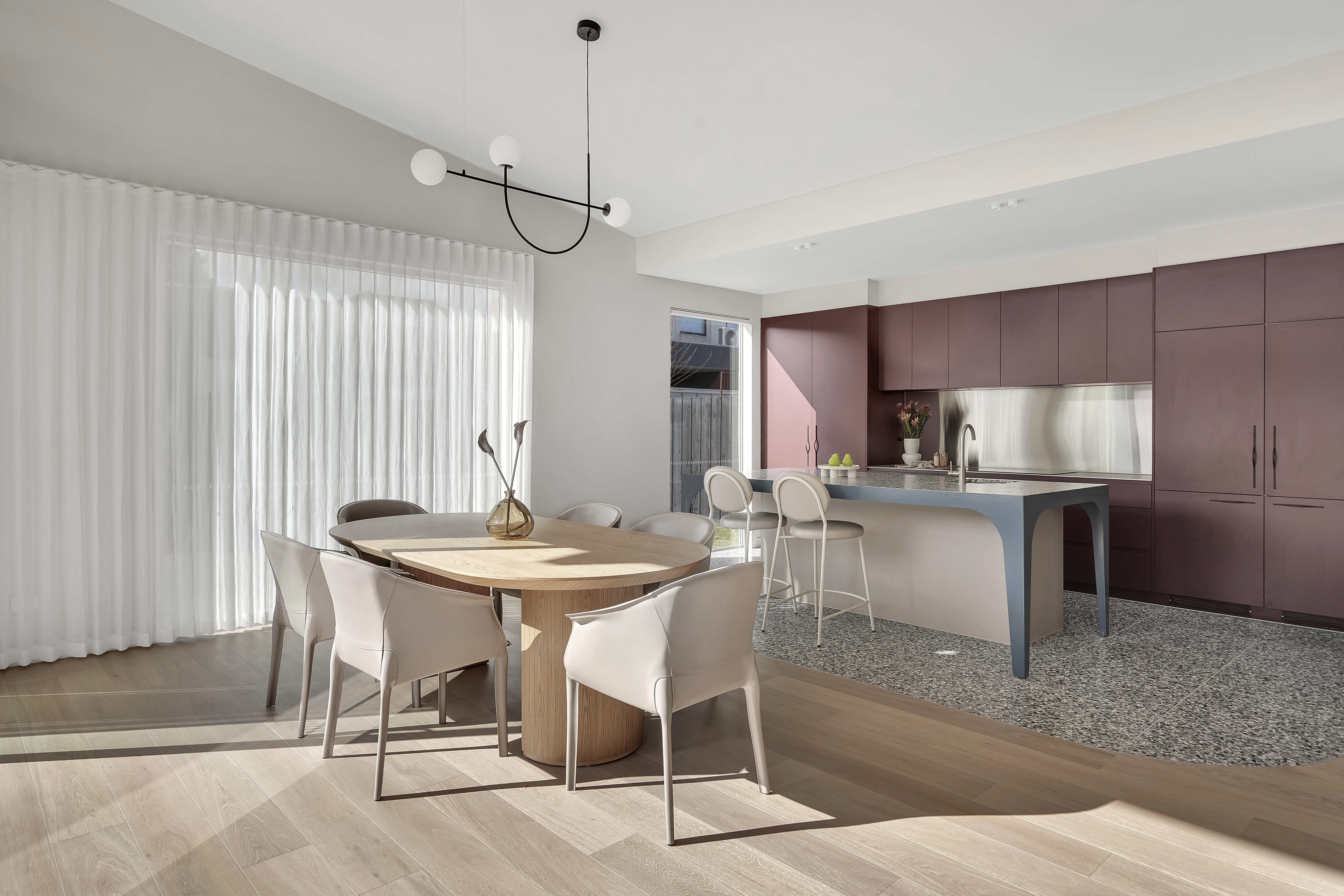 Ask anyone who’s been through 2 Anderson Street and they’ll tell you the same thing: the kitchen-living-dining space is the showstopper. Curved terrazzo floors, endless timber flooring, a bespoke steel island bench, feature Kalamata joinery, and stainless steel benchtops that whisper “I’m chic, but I also cook.” It’s a space that’s as photogenic as it is livable.