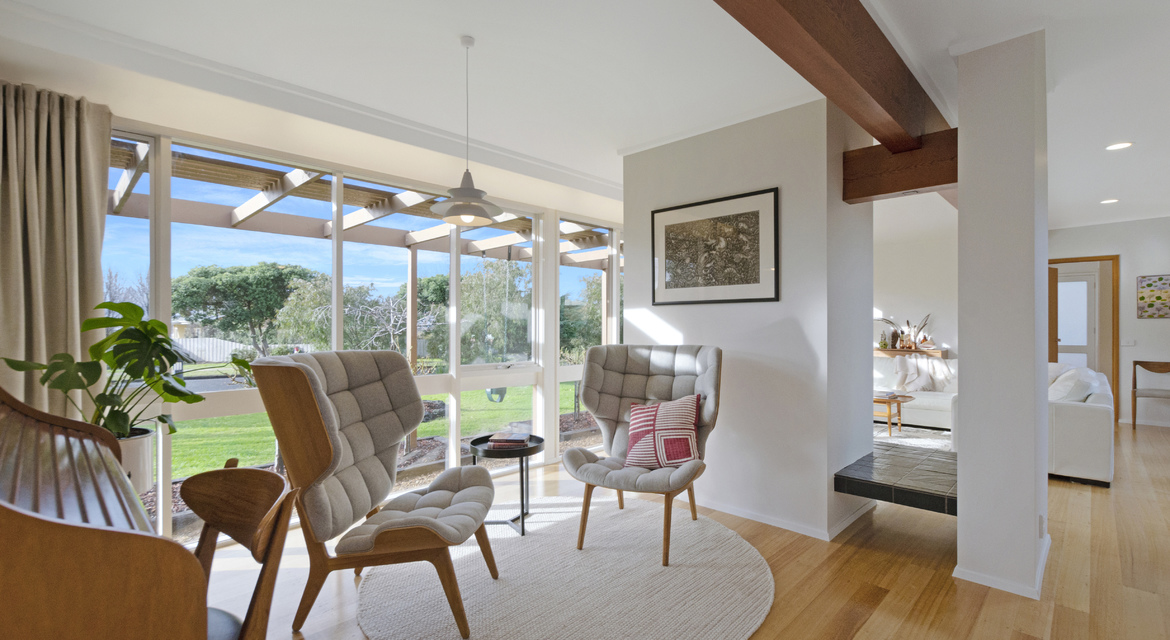 Then fate stepped in. A few months later, the home hit the market. Designed in 1974 by Melbourne architect Ian Burch (known for his work with Merchant Builders), it had all the hallmarks of classic MCM style: north-facing orientation, walls of glass, exposed timber beams, and a seamless connection between indoors and out. They didn’t hesitate—it became theirs.