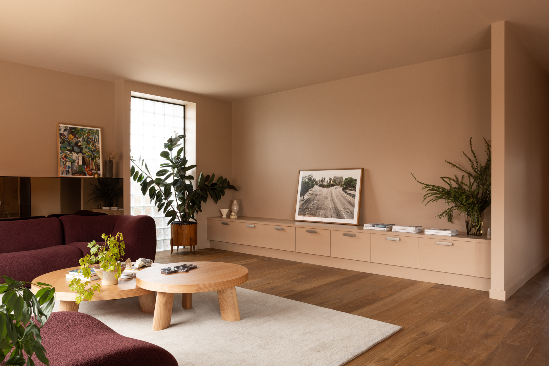 Anyone who’s followed BuildHer for a while knows how obsessed I am with living room function — not just how it looks, but how it works. So yes, we used this project as the perfect excuse to bring home the King Living 1977 couch (in Pinot Noir, no less). That one piece helped us plan the space around it — from the mirrored shelf behind (equal parts design moment and practical ledge) to the glass brick window that lights up the joinery.