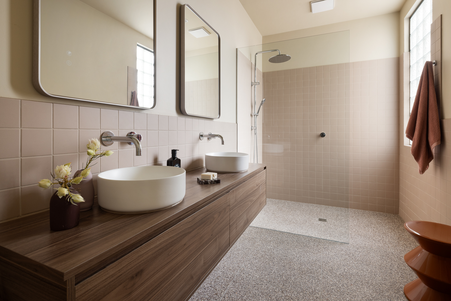 We’d been eyeing off Laminex’s new colour range and couldn’t go past Outback Clay. It felt warm, earthy, and just right for the kitchen cabinetry – so we ran with it and colour-washed the room to match with Dulux Kangaroo Pouch. It’s a cocoon of calm, grounded by intention and tone.