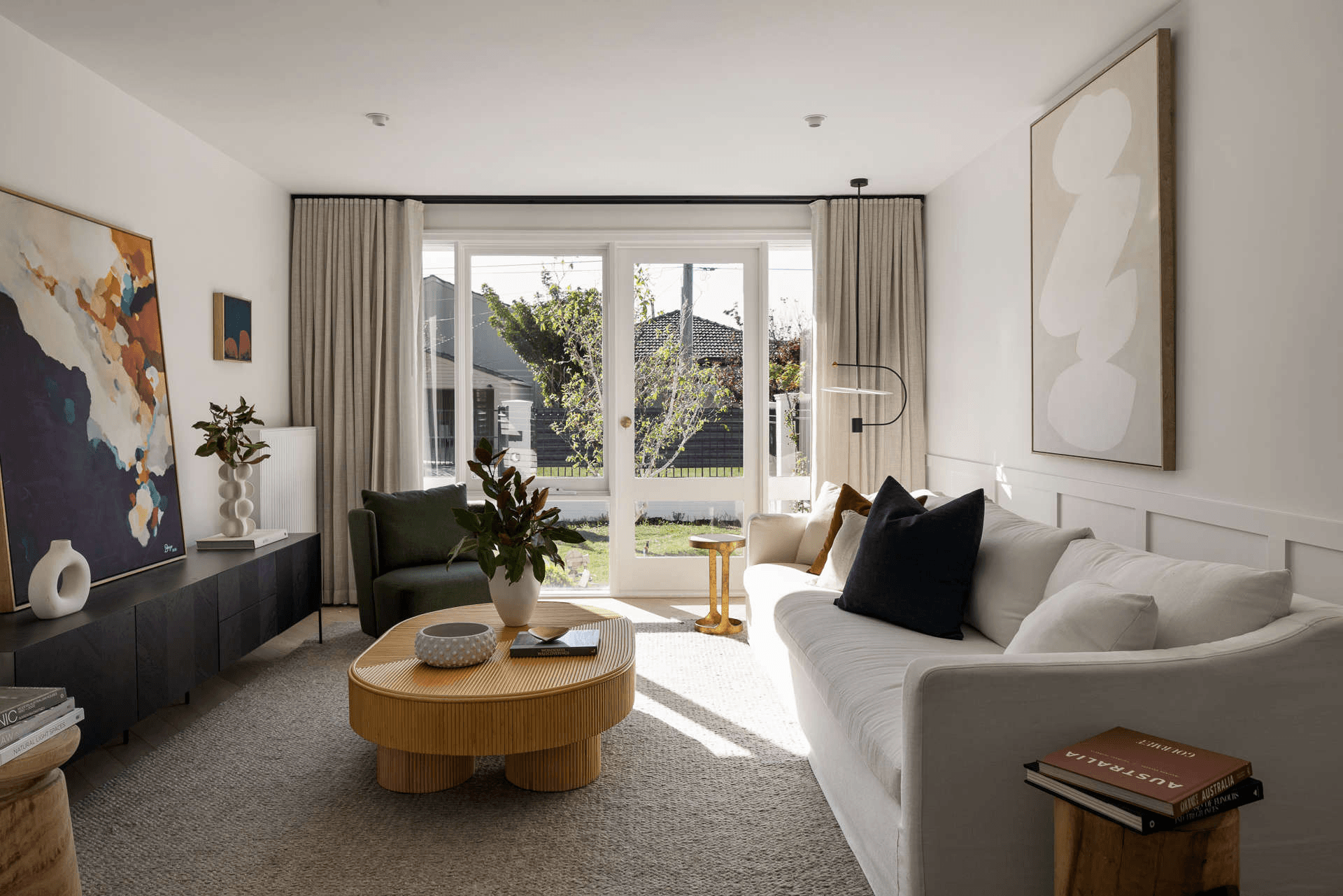 The façade was quite heavy and uninspiring but I was quickly able to find an inspo image on Instagram which enabled me to easily reimagine and transform the house into a charming home. For the extension living area, I fell in love with an image on Instagram with a raked ceiling which is a key feature of the home due to the natural light and feeling of space.
