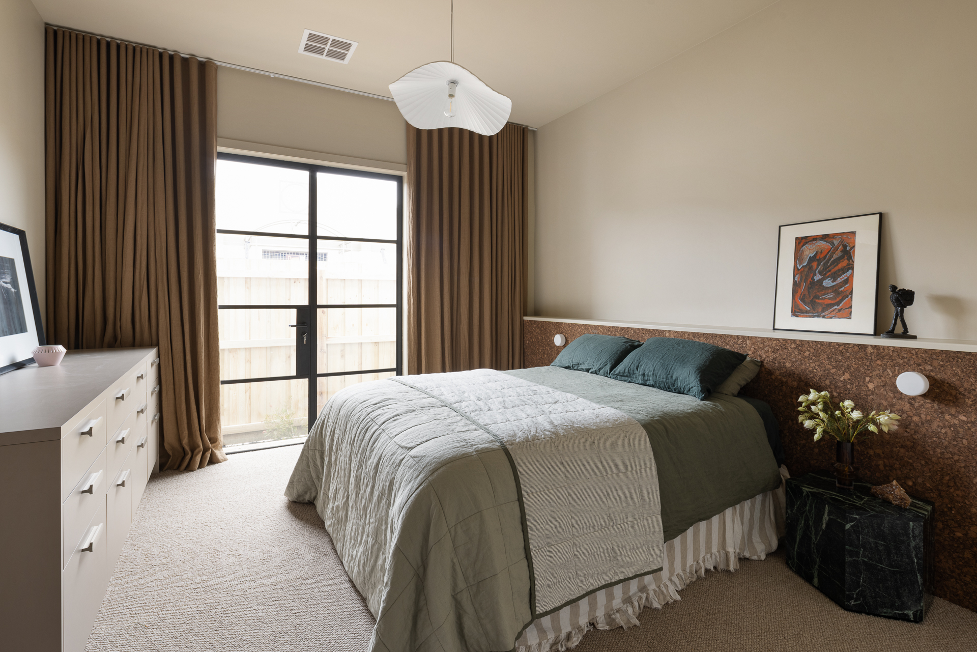 - Master Suite: A private retreat with full-width wardrobes and a spacious ensuite. Double doors open to the garden — it’s light-filled, calm, and feels like a little hotel moment at home with our cork bedhead.